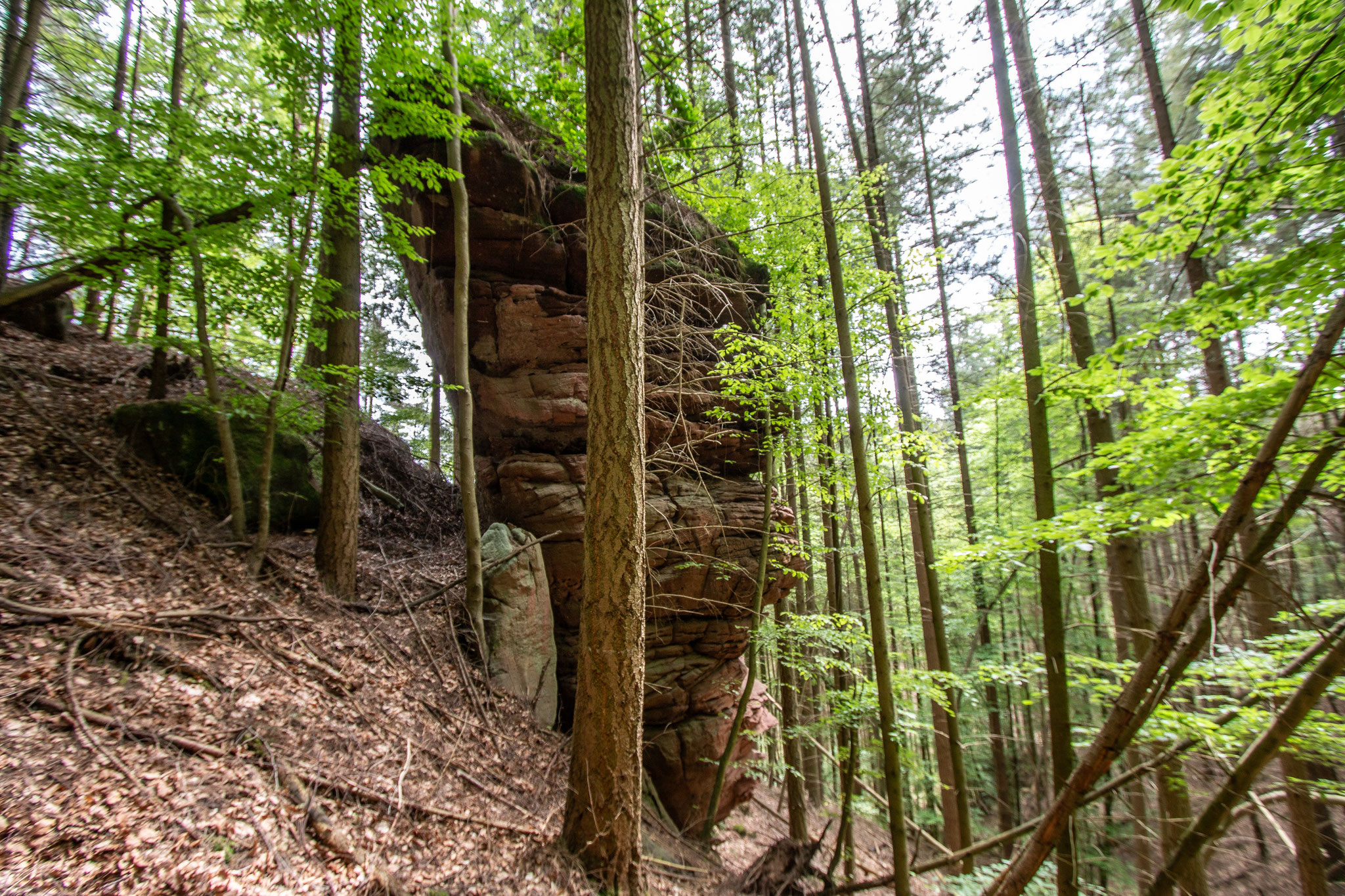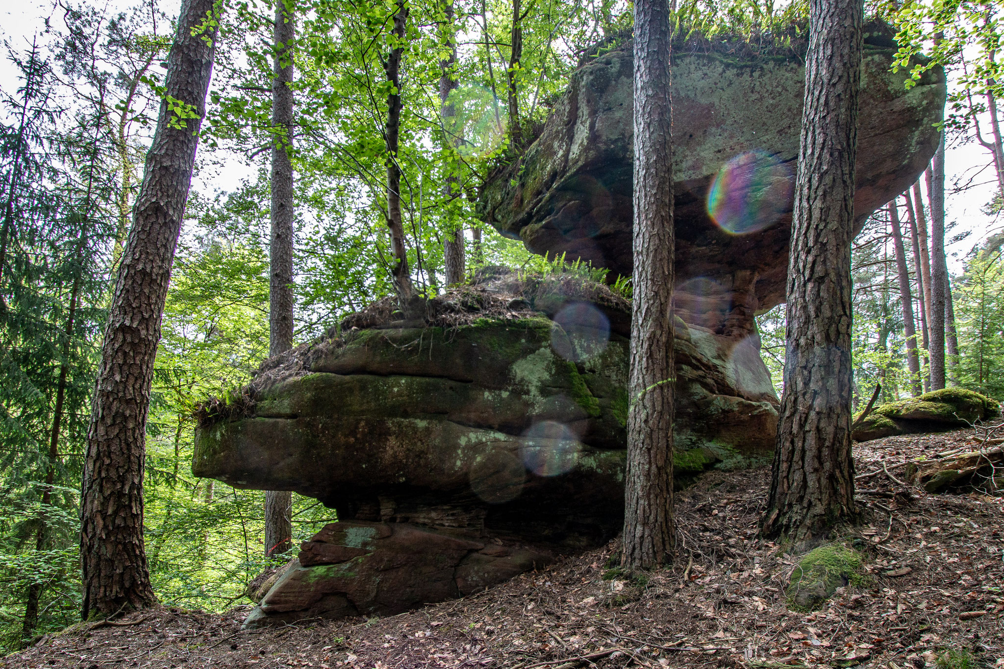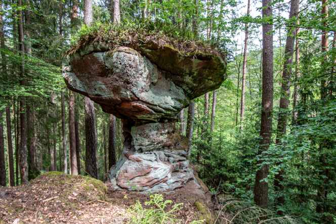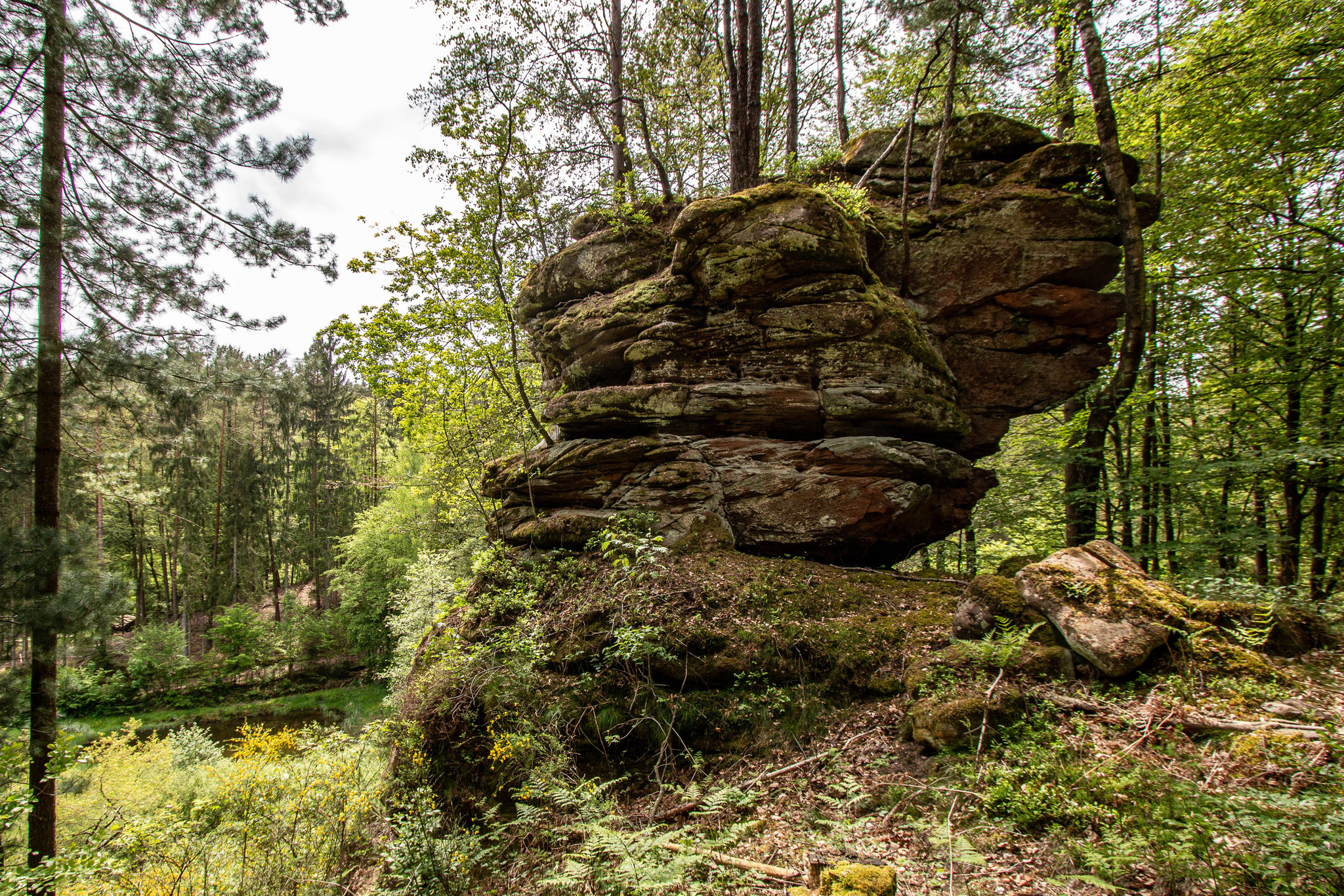 In der Nähe der Fischweiher bei der Erfweiler Klamm stehen versteckt im Wald einige kleine Felstürme und Boulder.