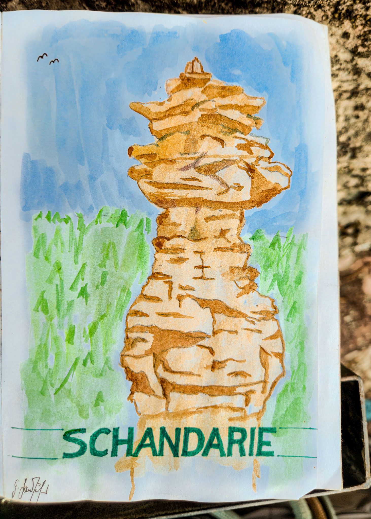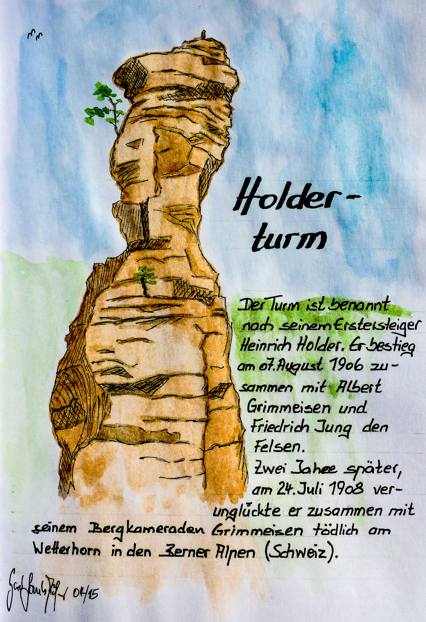 Mittlerweile gibt es Gipfelbücher auf folgenden Felsen: Holderturm, Schandarie (1. SL), Schandarie-Vorgipfel (Neu), Schäferturm. Also nix wie hingehen und hochklettern.