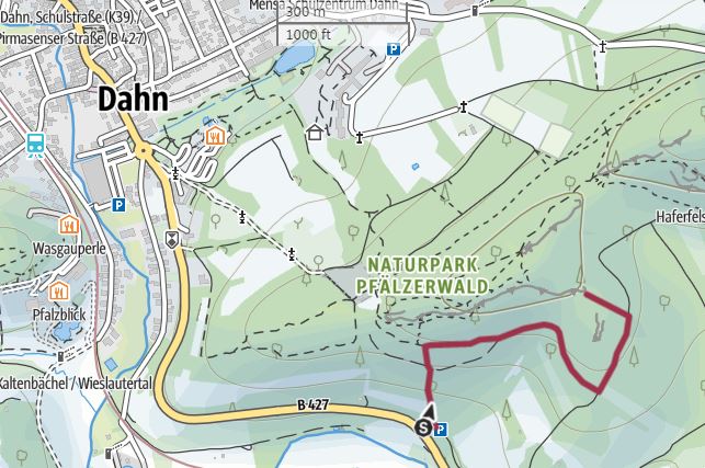 Anfahrt: Auf der B427 ca. 1 km östlich von Dahn rechts auf den
