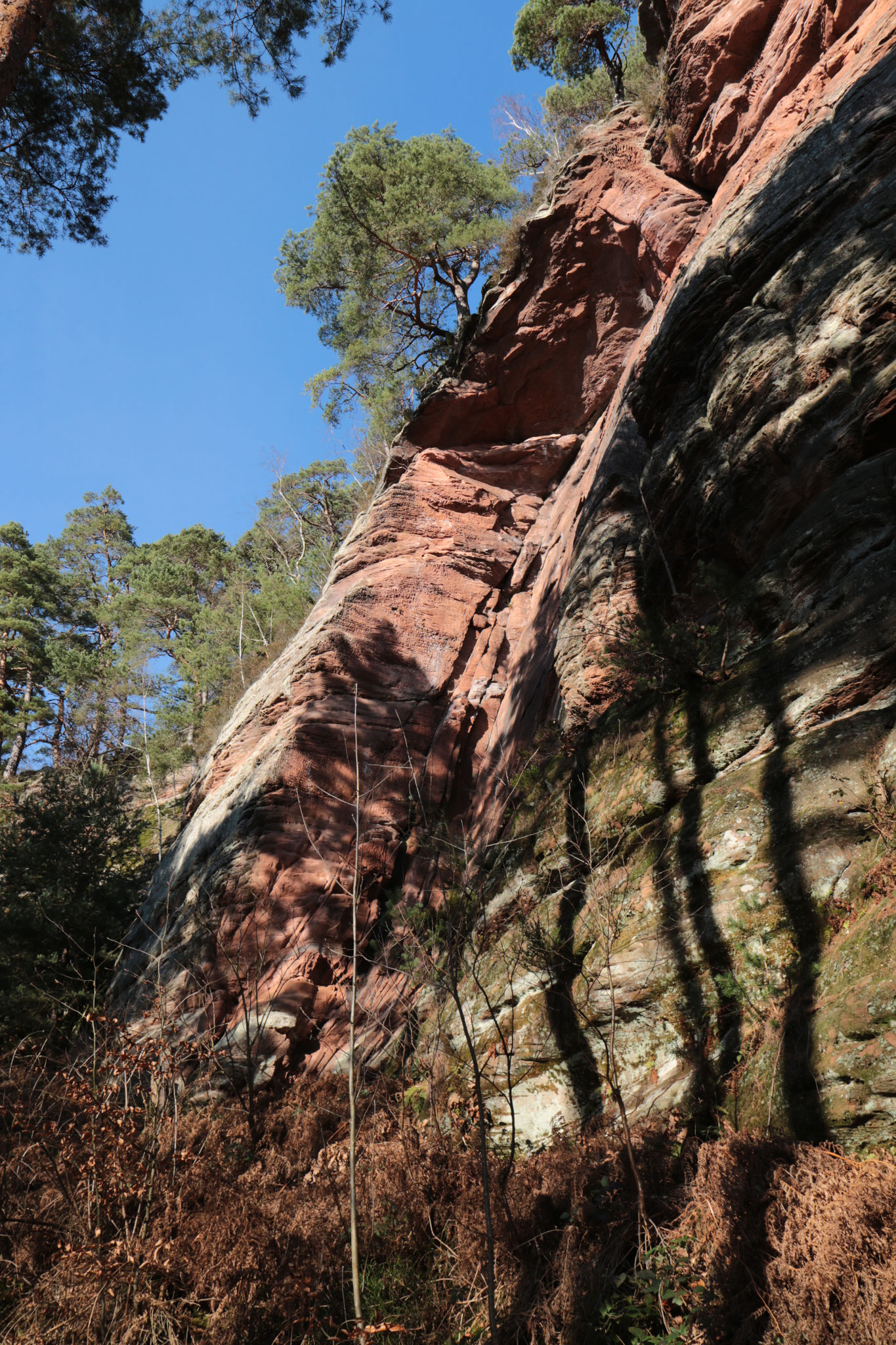 Südwestlich der Burgruine Altdahn befindet sich die Schützenwand. Wenn es mal gewittert hat findet man hier ein Stückchen trockenen Fels mit anspruchsvollen Wegen. Insbesondere die Südverschneidung (6) ist ein lohnendes Unternehmen. Aber auch die Routen rechts davon sollten versucht werden.