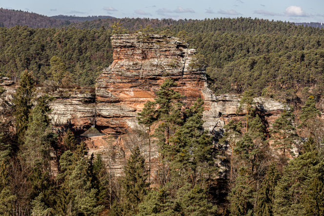 Auf den Dahner Felsenpfad gelangt man über eine Treppe von Norden in das riesige Felsfenster und hat einen herrlichen Ausblich auf die Lämmerfelsen.