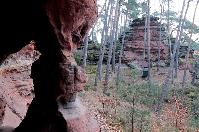 Am Dahner Felsenpfad gelegen. Um Ostern finden hier immer die internationalen Sportbogen-Weltmeisterschaften statt. Daher stehen überall im Wald diese schwarzen Zielscheiben.