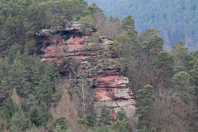 Schöner Aussichtsfels über dem ehem. Landschulheim mit Blick auf Dahn und die umliegenden Felsen.