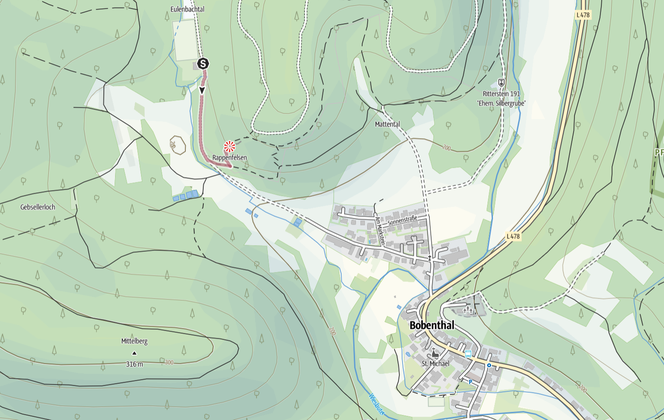 Zustieg: Vom nahe gelegenen Sportplatz in Bobenthal die Straße ein kurzes Stück zurück laufen und links dem Pfad 50 m folgen und dann über Pfadspuren steil nach oben zum Wandfuß. Wer an die Aussicht möchte läuft den Wanderweg weiter und dann über Serpentinen weiter zur Aussicht.