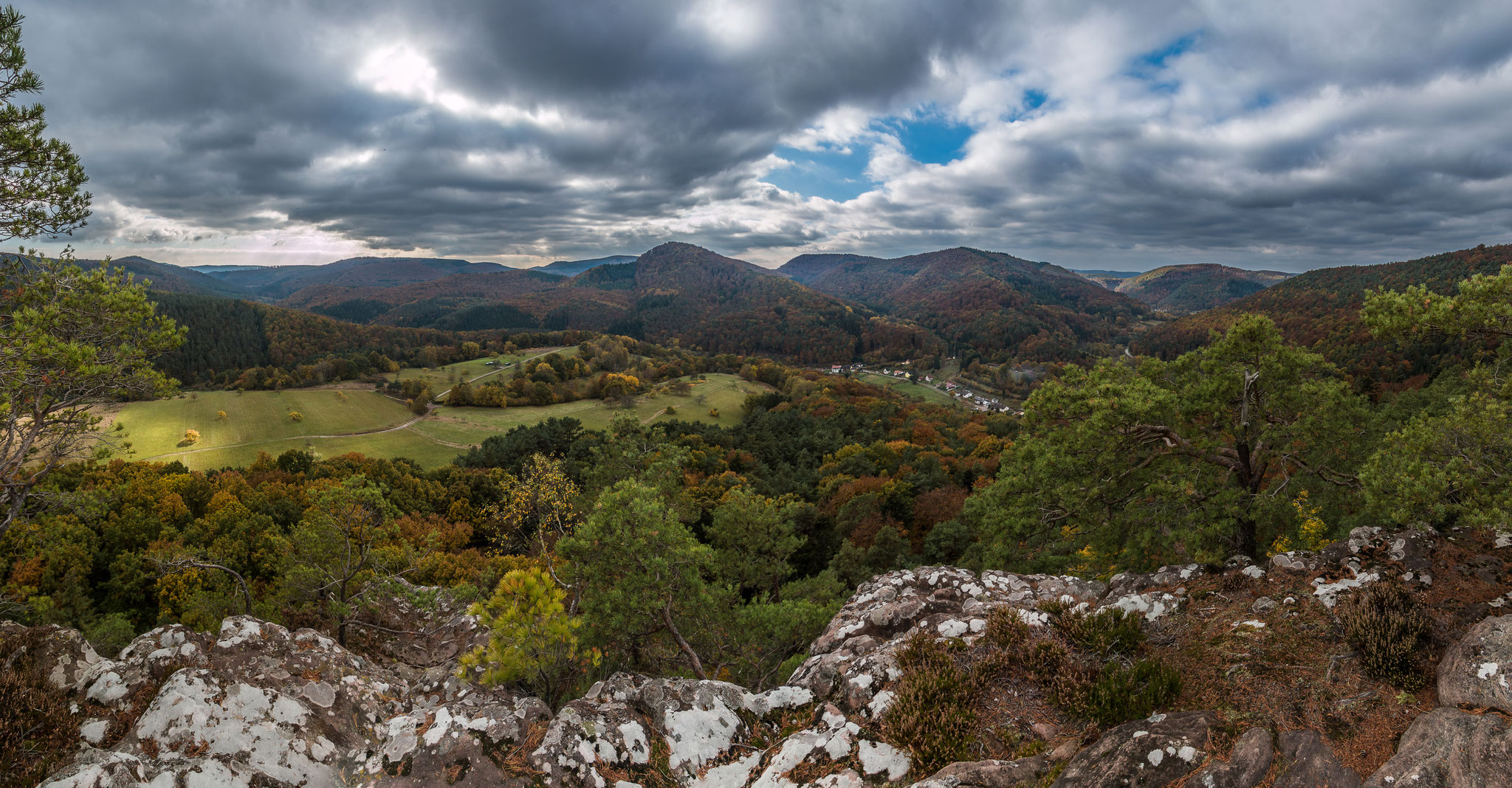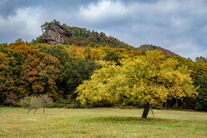 An der Grenze zum Elsaß thront hoch über Hirschthal der Fels. Ein imposantes Gebilde mit herrlicher Obstbaumwiese davor, die zum Picknick einlädt. Auch vom Gipfelmassiv hat man einen herrlichen Blick rüber zur Ruine Fleckenstein und ins Tal von Hirschthal.