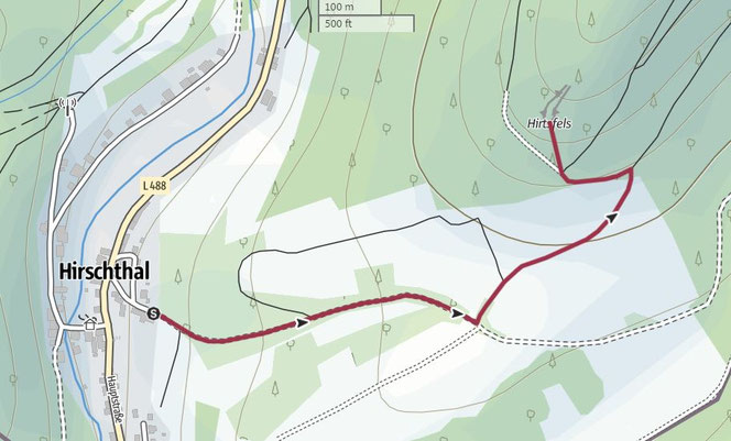 Zustieg: In Hirschthal in die Bergstraße den Hohlweg nach Osten hoch bis zur Obstbaumwiese und an der Kreuzung nach Norden zum gut sichtbaren Fels.