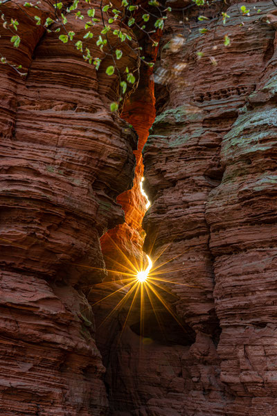 Felsenglühen an den vom Abendlicht beschienenen Felsen. Dieses ganz spezielle Naturschauspiel gibt es nur im Frühjahr, wenn die Bäume noch nicht im Laub stehen und der hintere Felspfeiler von der untergehenden Sonne angestrahlt wird.