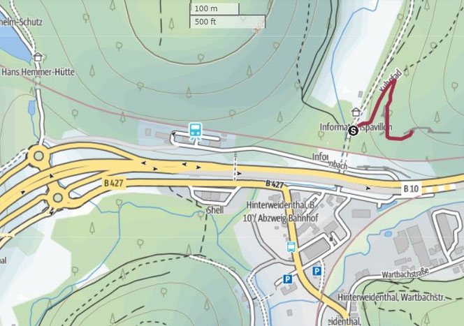 Anfahrt: Von der B427 Richtung Bahnhof und am Forsthaus nach Norden unter der Bahnlinie hindurch zum Parkplatz.
